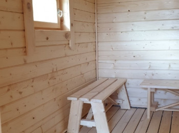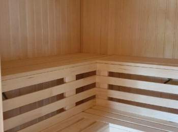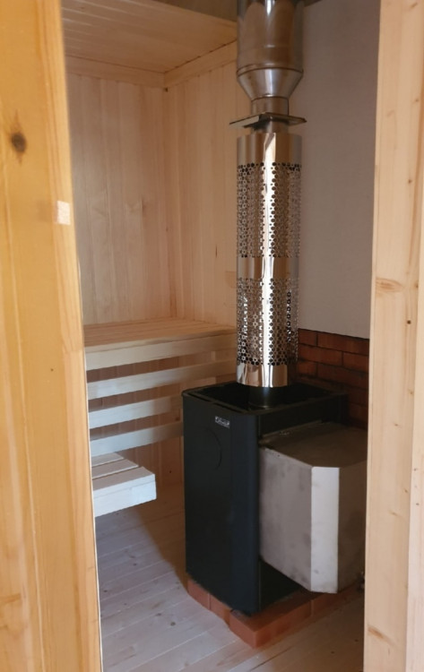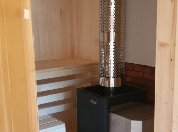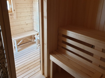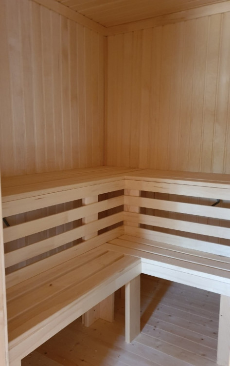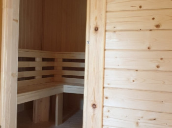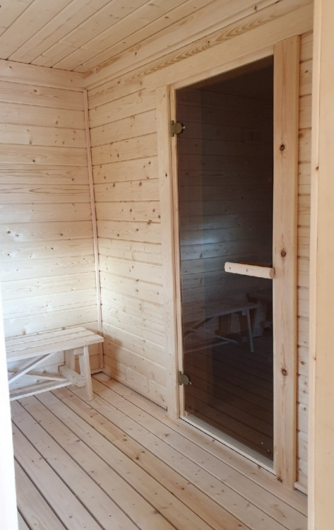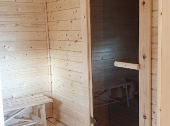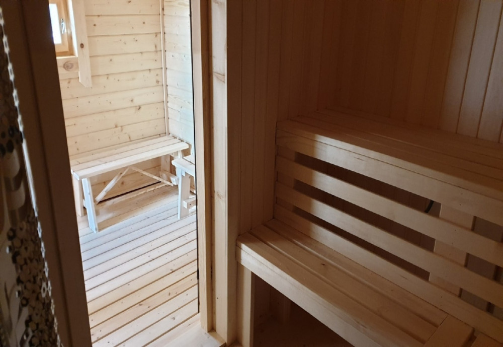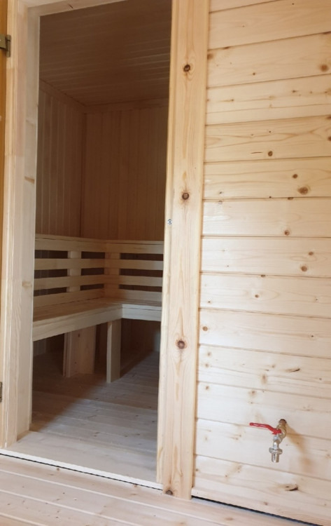 Внутренняя отделка имитацией бруса 20*146 мм в комнате отдыха и мойке, парная полностью отделана осиновой вагонкой кат. Экстра