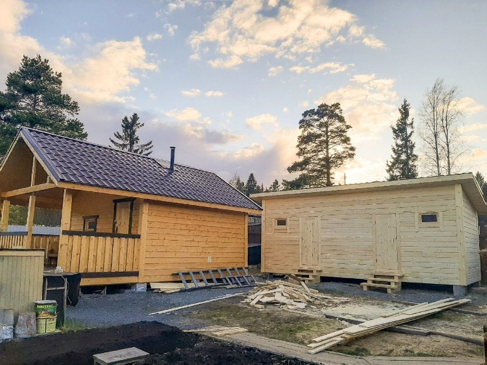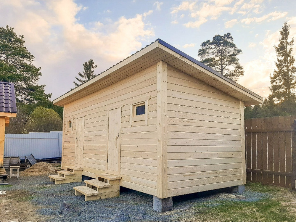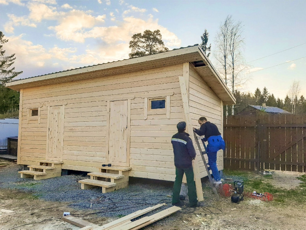 Хозблок 3*7 метров на 2 отделения в Соломенном Фундамент белонные блоки ФБС Стены обшиты имитацией бруса На крыше металлочерепица