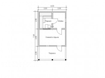 Компактный проект каркасной бани, выполненный в габаритах 4*7м, обладает продуманной и эргономичной планировкой. Его внутреннее пространство разделено на три функциональные зоны: парную, мойку и просторную комнату отдыха, где можно с комфортом разместиться компанией после принятия водных процедур.